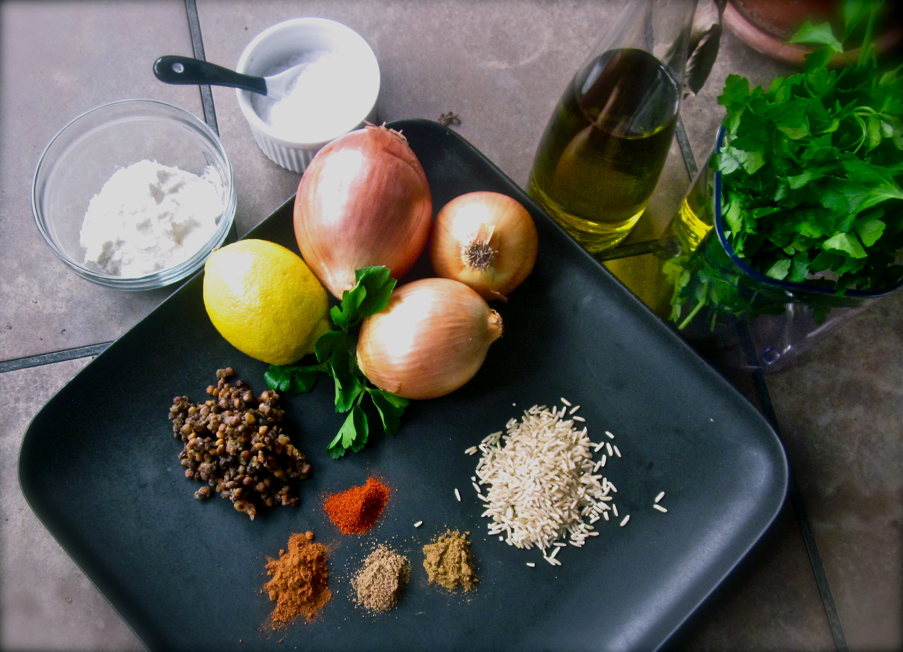 - Now, the Mjaddara: Put the butter and olive oil in your deep sauté pan over medium-low heat. When the butter melts, add the onions and stir frequently for about five minutes until they soften a bit and the layers break apart. Reduce the heat to low and keep stirring every minute or so. You want them to cook slowly, brown but not burn. Sprinkle them with a little salt and let them cook for 30 minutes to an hour (keeping an eye out and stirring when necessary) while you make the rest of the meal. If you find that they are drying out quite a lot, add a little water, a tablespoon at a time, and reduce the heat a bit.