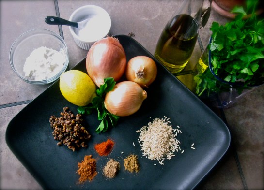 - When the onions are a beautiful deep brown and taste soft and sweet, turn the heat up to medium and let the onions get a bit crusty on the bottom. Don’t stir them, just char them a little for about three minutes. Scrape the contents of the pan into the bowl with the lentils and add the cooked rice. Mix it all together. It only gets better the longer you let it sit, so don’t worry about taking it right to the table. Garnish with parsley sprigs, give the yogurt a final stir and taste for seasoning, and serve.