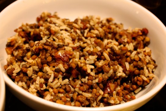 - Lentils go in your saucepan with about a quart of water and a big pinch of salt. Bring to a boil, reduce heat to low, and cook for 20 minutes. While these cook, your rice should be getting close to done and the onions should be nice and translucent. When the lentils are soft but not mushy, drain them and dump them into your big bowl.