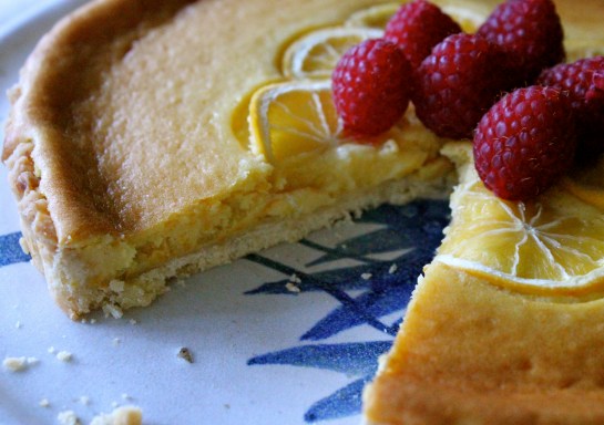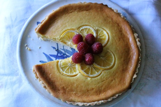 I used Martha’s recipe for both the crust and the filling, but honestly, it’s a LOT of butter. You can follow hers, or you can use this one, which I adapted from The Greens Cookbook by Deborah Madison. Both are utterly versatile and utterly delicious. For garnish, you can see I used raspberries, but serve it plain if you like; it’s mostly the color that I love. I also sliced one of my zested lemons extremely thin and arranged them in a little circle on top (well, it WAS a Martha Stewart recipe), but this is also totally optional. If you decide to do this, make sure you slice them super super thin to get them to sweeten up in the oven, otherwise they will be beautiful and also sour, chewy, and the part of the pie that ends up pushed to the side of your plate.