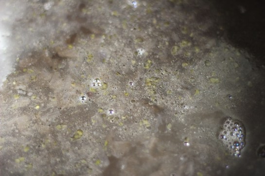 3. Add the oregano or epazote, bring to a boil, and then reduce the heat to medium-low. Simmer, partially covered, until the beans are thoroughly tender (about 2 hours). There should be no chalkiness at all when you break a bean open. You’ll need to gently stir the beans regularly and add water as necessary to keep the liquid a generous ½” above the beans.