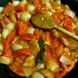 3. Heat about 2 tablespoons of olive oil in your large skillet and add the onions, garlic, and dried herbs. Saute over medium heat for several minutes. Salt lightly, add the tomatoes, and turn down the heat to medium. Cook for about 7 minutes until the juices of the tomatoes have evaporated and you have a thick sauce. Season with pepper and pour into your baking dish.