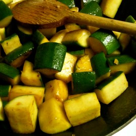 4. Add another tablespoon of olive oil to the pan and, when it is hot, add the zucchini and salt lightly. Saute briskly until the zucchini is golden and beginning to soften, about 6-8 minutes. Dump the contents of the skillet into the baking dish with the tomatoes. Wipe out the pan, heat another tablespoon of oil, and saute the peppers for about 5 minutes, letting them color just a little, then add them to the baking dish.