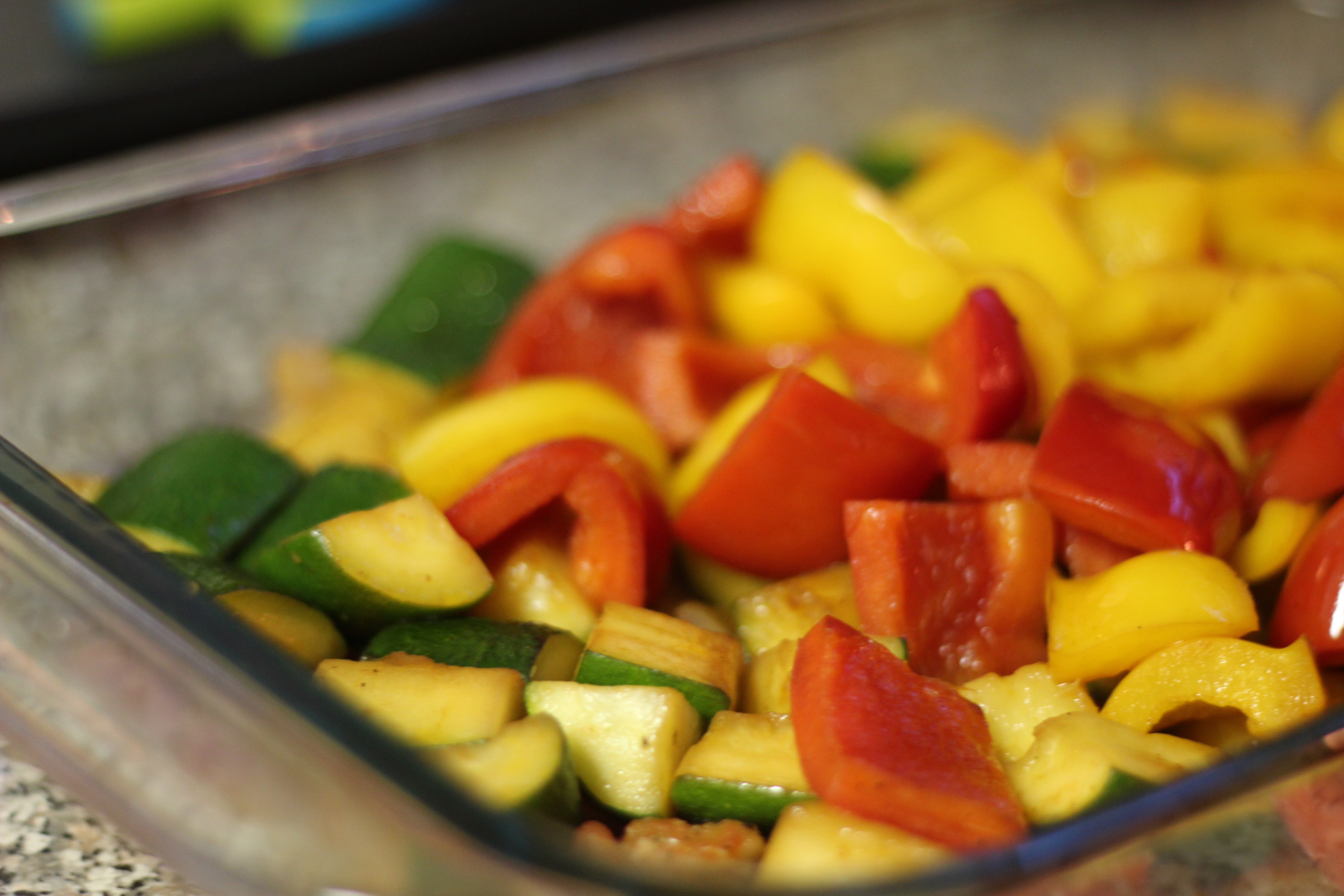 2. Halve the peppers lengthwise, remove the seeds and veins, and cut them into strips about ½” wide and 1½” long. Chop the onion into ½” squares. Submerge the tomatoes in boiling water for 10 seconds, remove the skins, halve them crosswise, and gently press out the seeds. Chop the flesh into large pieces. Quarter the zucchini lengthwise and cut it into pieces 1 inch or so long. Finely mince the garlic. Preheat the oven to 350°F.
