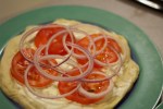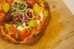 tomato sauce, smoked queso fresco, cherry tomatoes, onions, leeks, green pepper