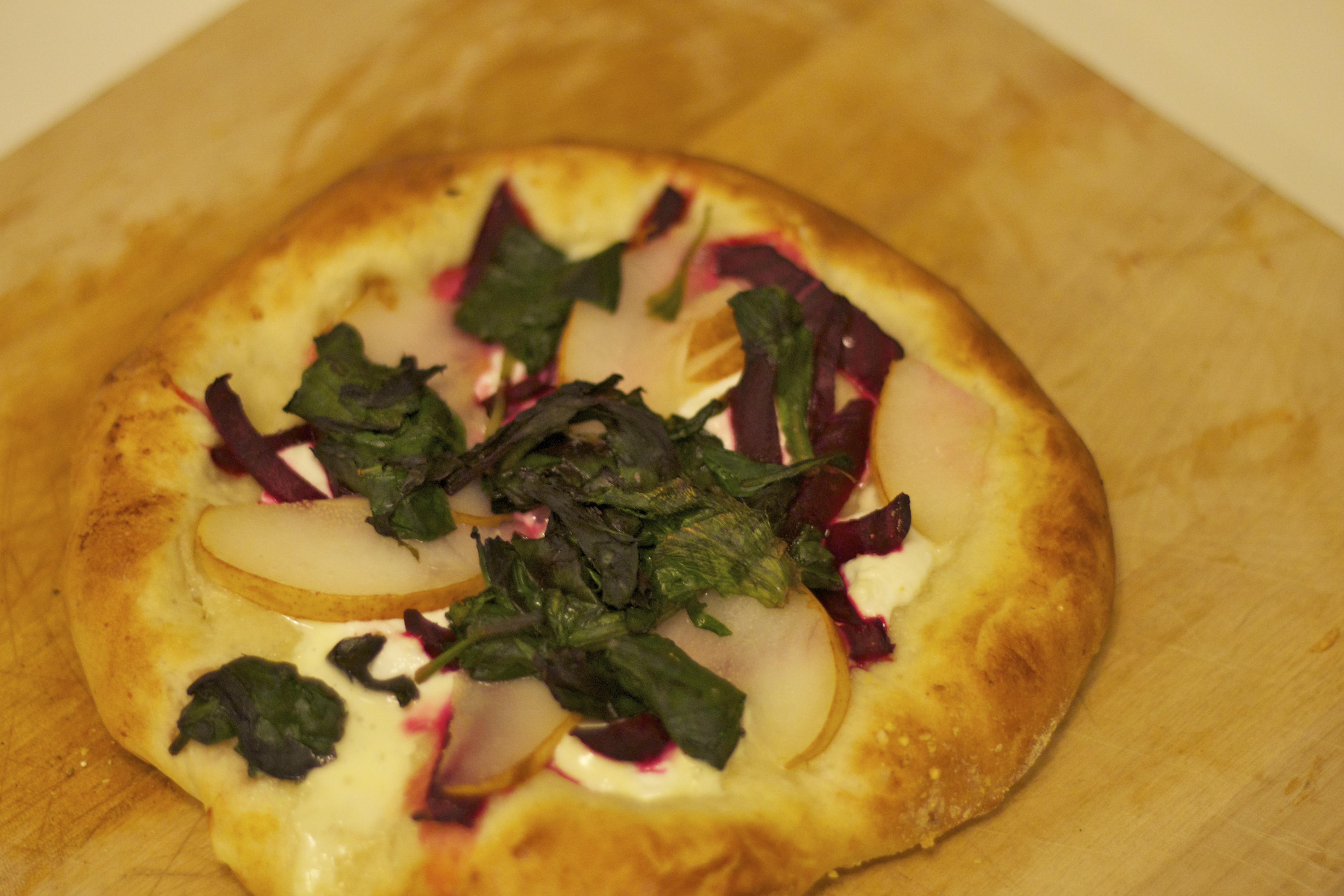 green pepper, corn, onion, beet greens, leeks, tomatoes, fresh mozzarella, goat cheese