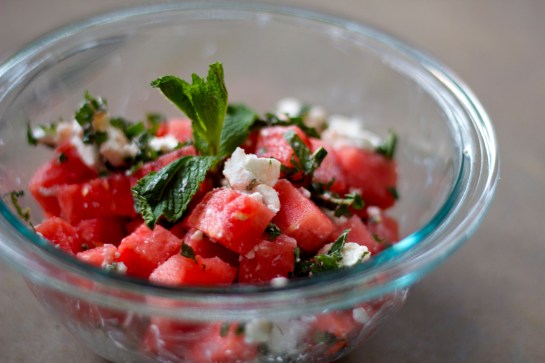 Ok, enough chattering (almost). If you’ve never thought of adding cheese and herbs to watermelon, I promise you will be pleasantly surprised. Don’t love feta? Try just the mint. Not a mint-lover? Try a squeeze of lime juice, a few cilantro leaves, and some queso fresco. Endlessly variable, unfussy, and incredibly refreshing: the perfect hot-weather salad. (It goes real good with mojitos, too. Just saying.)