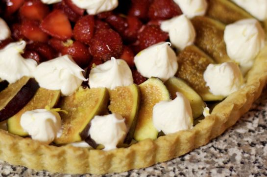 6. Slice the figs stem to end in ¼” slices. Combine the honey and mascarpone cheese in a small bowl and spread about half over the cooled crust. Pile the drained strawberries in the center and arrange the figs in a slightly overlapping pattern around the edge.
